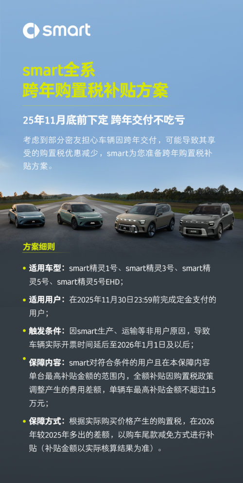 方案明确:即日起至 2025 年 11 月 30 日(含),凡购买 smart #1、#3、#5、#5 EHD 超级电混车型并支付定金的用户,若因非自身原因导致车辆开票时间延后至 2026 年 1 月 1 日及以后,smart 将全额补贴购置税政策调整的费用差额,单辆车最高补贴 1.5 万元。